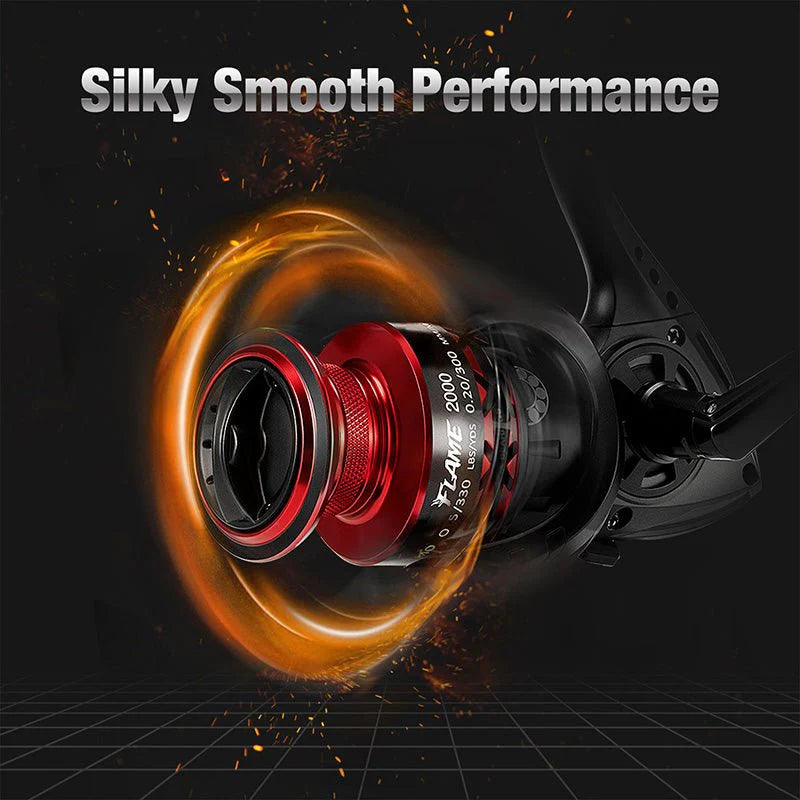 Exquisite Appearance - The matte black body paired with red aluminum spool, perfectly indicate its name Flame. You will be flattered by having this sharp and modern spinning reel with unique hollow body, X shape spool and personalized handle. Far more advanced feeling than other reels at its price.